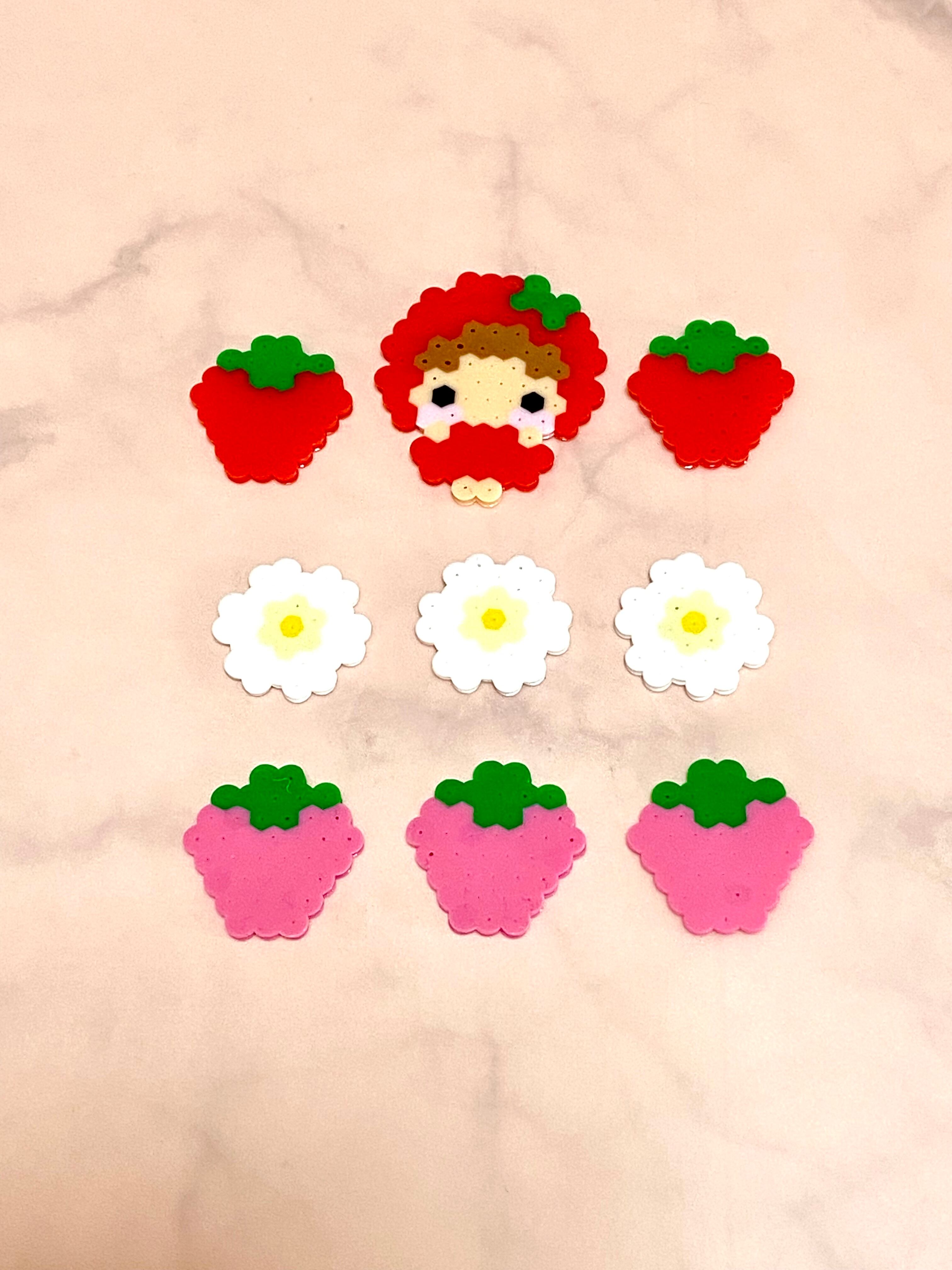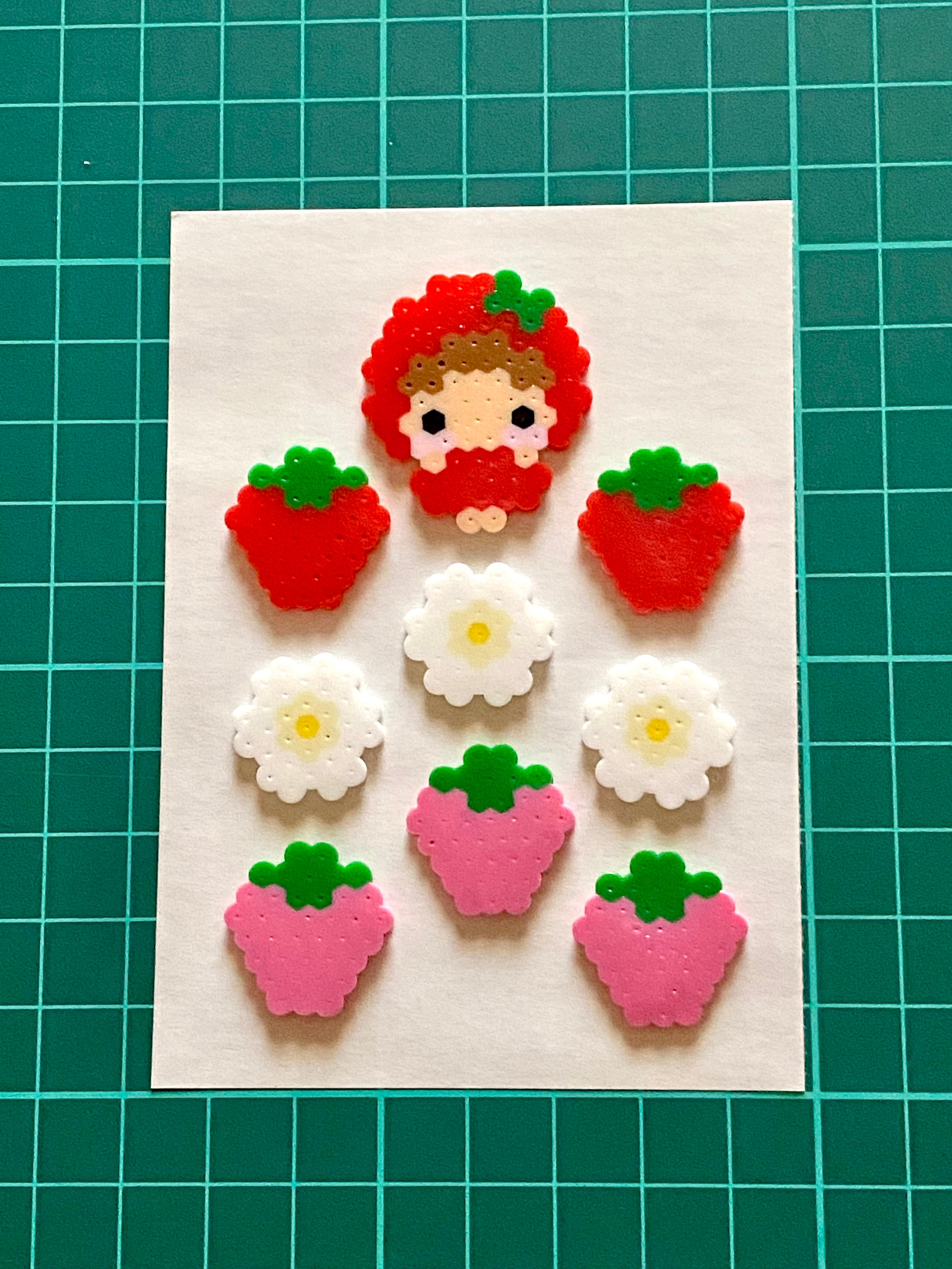 愛らしいアイロンビーズで作った、いちごのデコシール!このキュートなデザインは、スマホケースや小物に貼れるので、あなたの持ち物をさらに華やかに演出します。