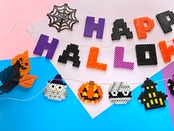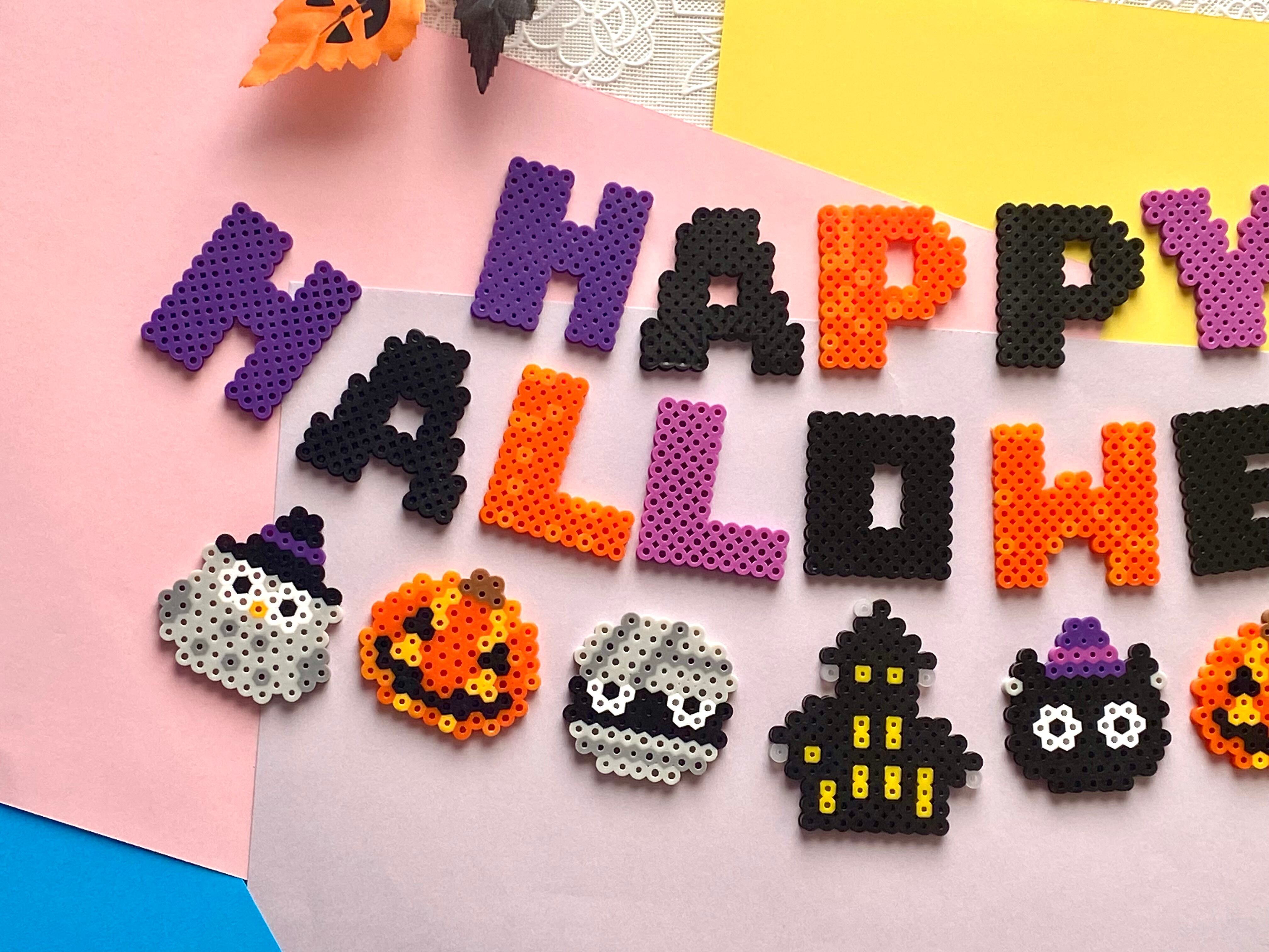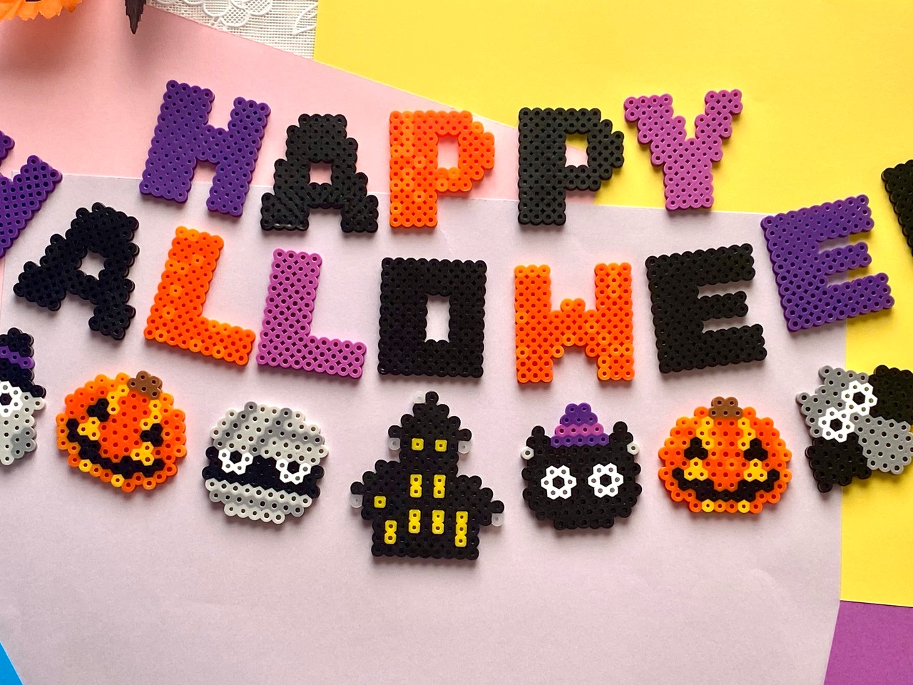ハロウィンを楽しく演出するアイロンビーズのガーランドです。黒を使った文字がちょっぴり大人な雰囲気を醸し出すデザインで大人からお子様まで、ハロウィンパーティーの気分を盛り上げてくれること間違いなしです!