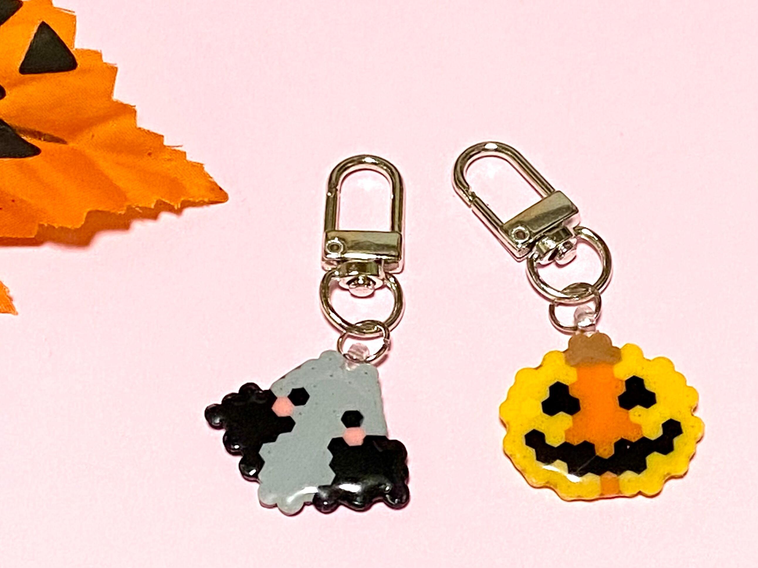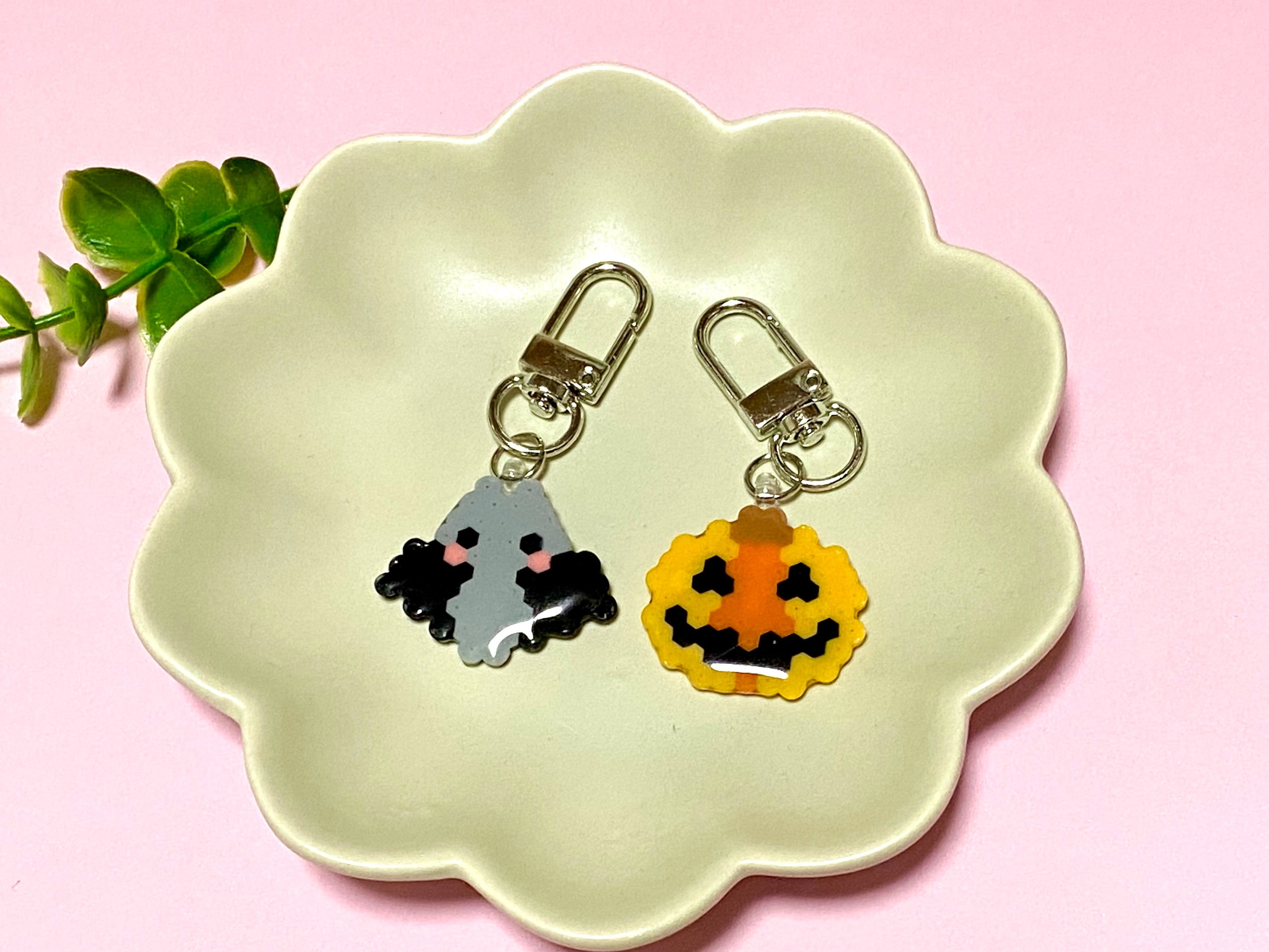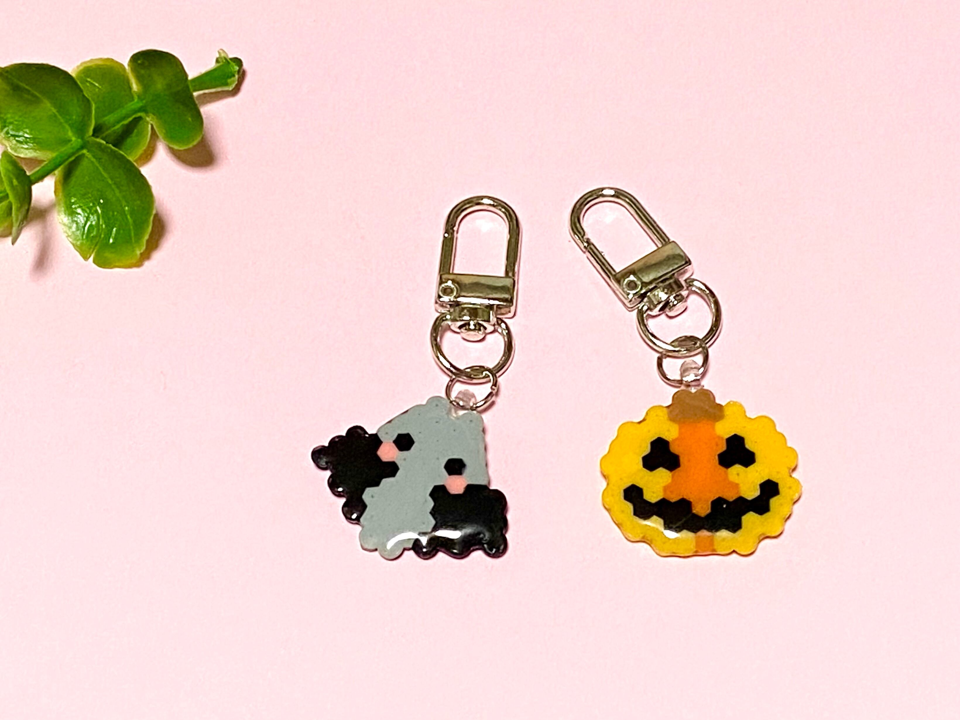 アイロンビーズとレジンを使用して手作りされた、かわいらしいハロウィンのキーホルダーです。小さなカボチャとコウモリがツルツルの仕上がりで、ハロウィン気分を盛り上げること間違いなしです。