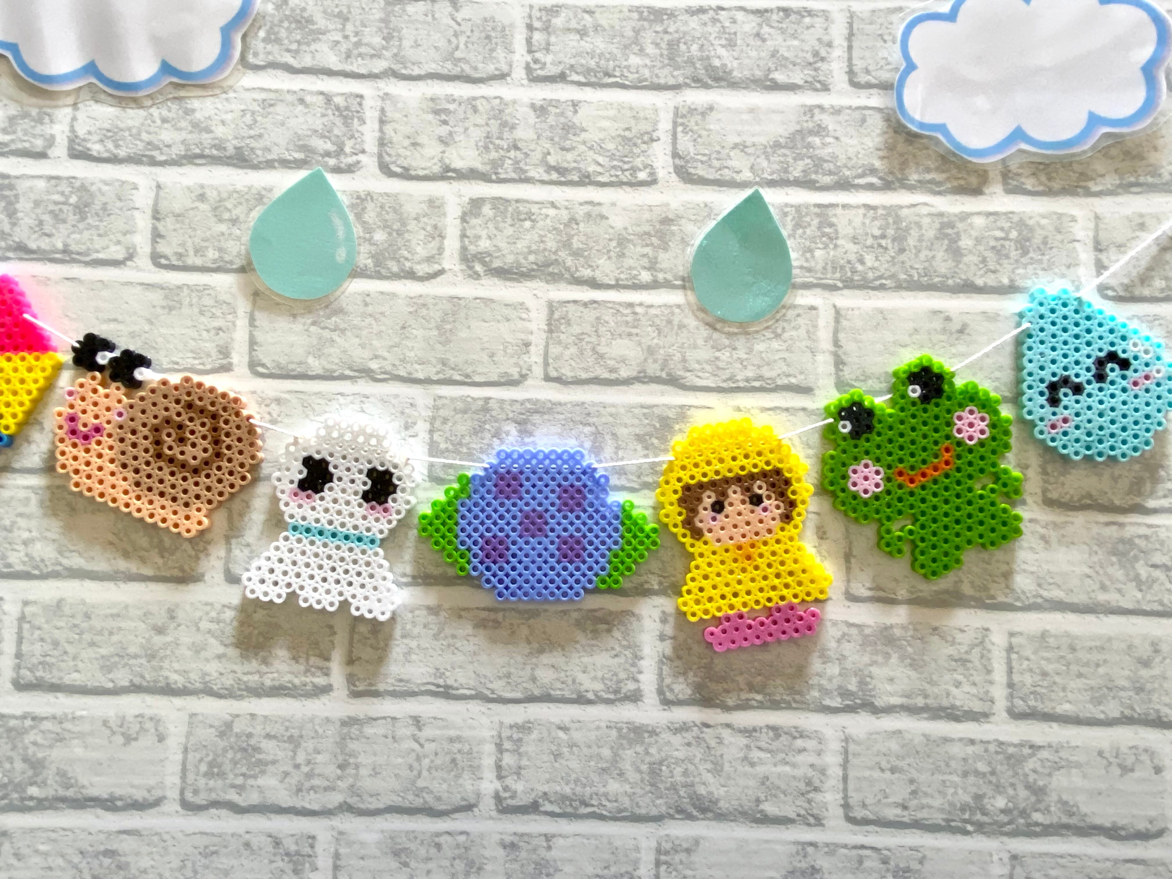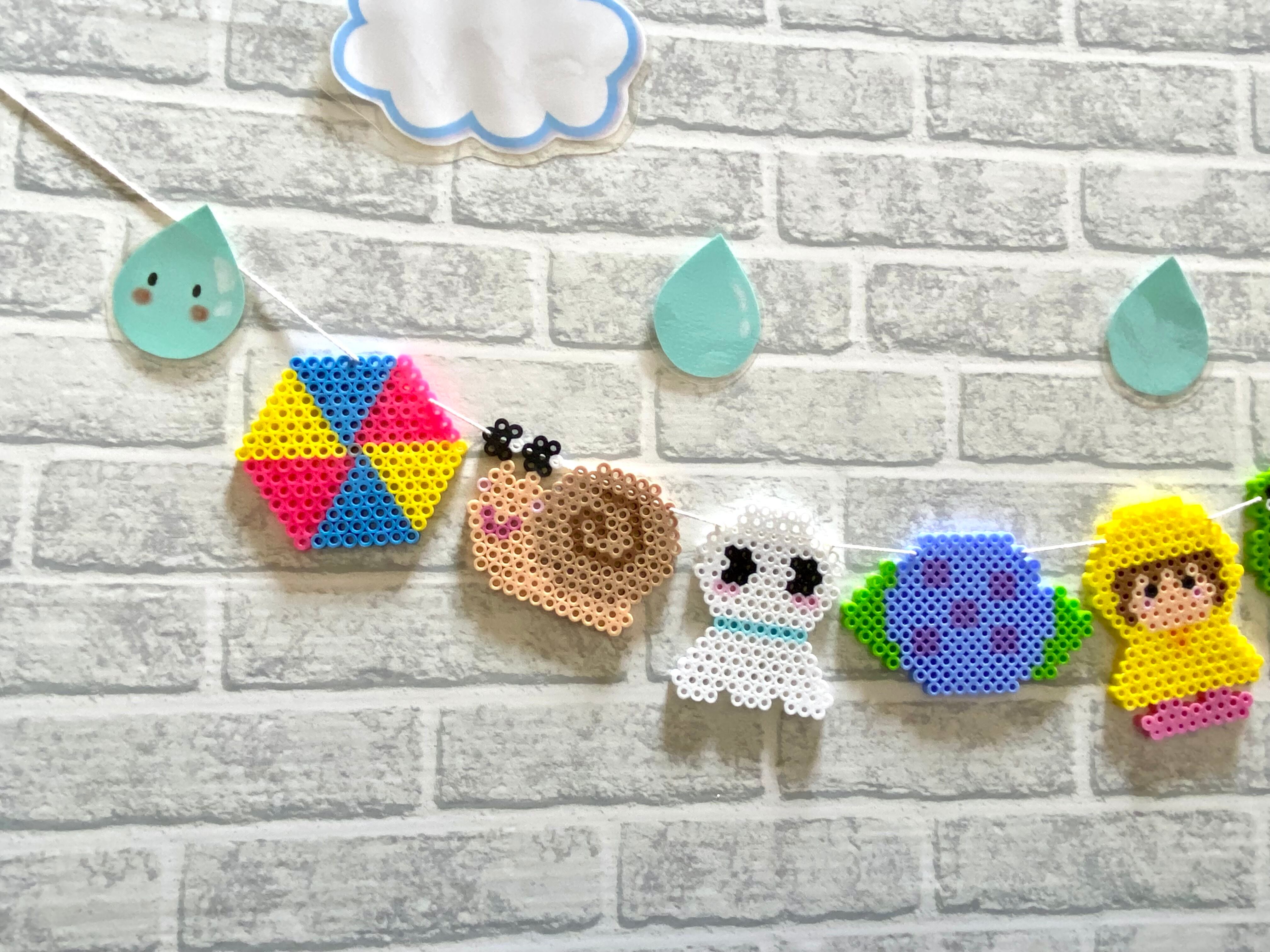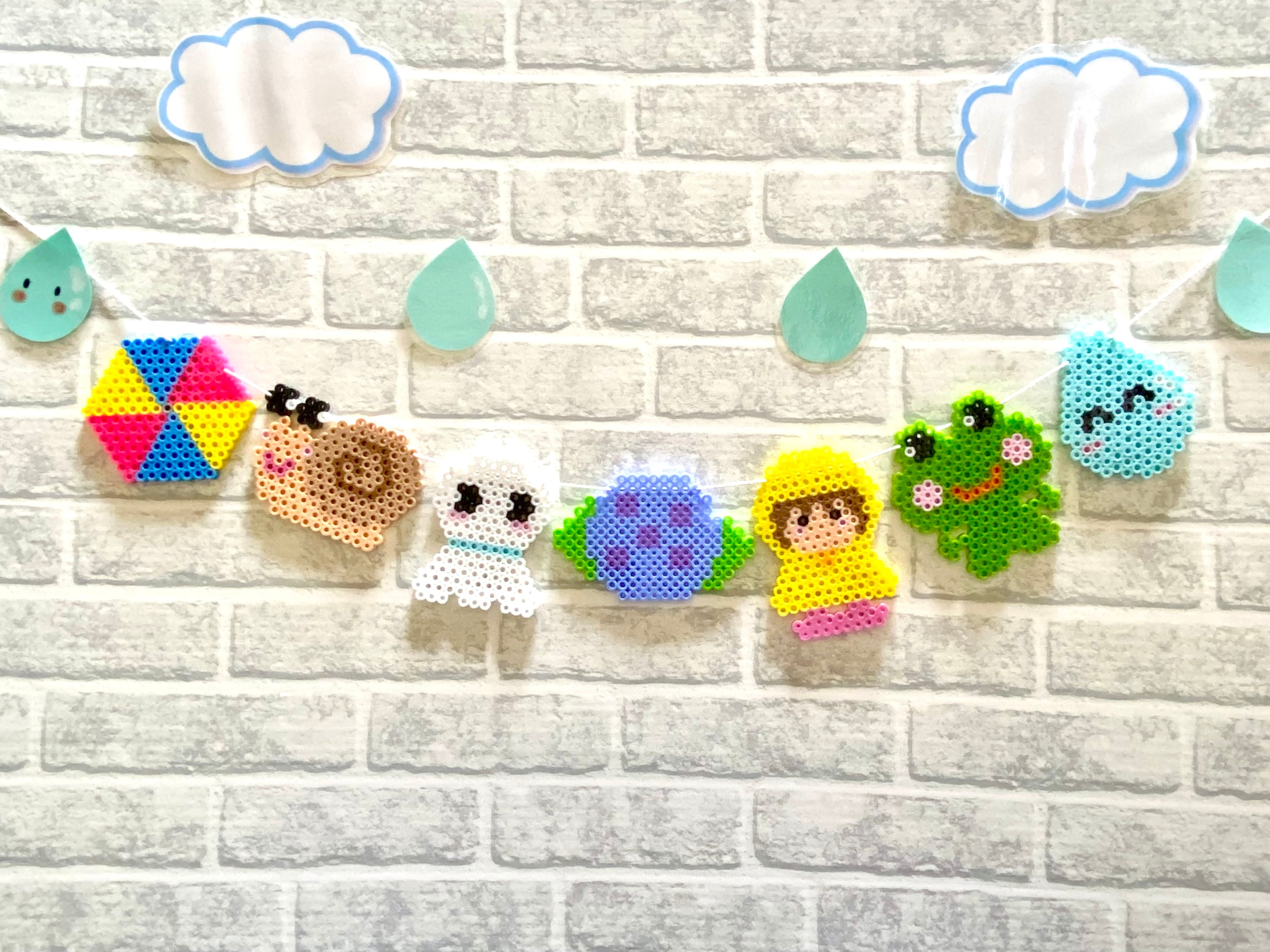 明るいカラーのビーズがハッピーな気分を呼び起こす、アイロンビーズで作った梅雨のガーランドです。