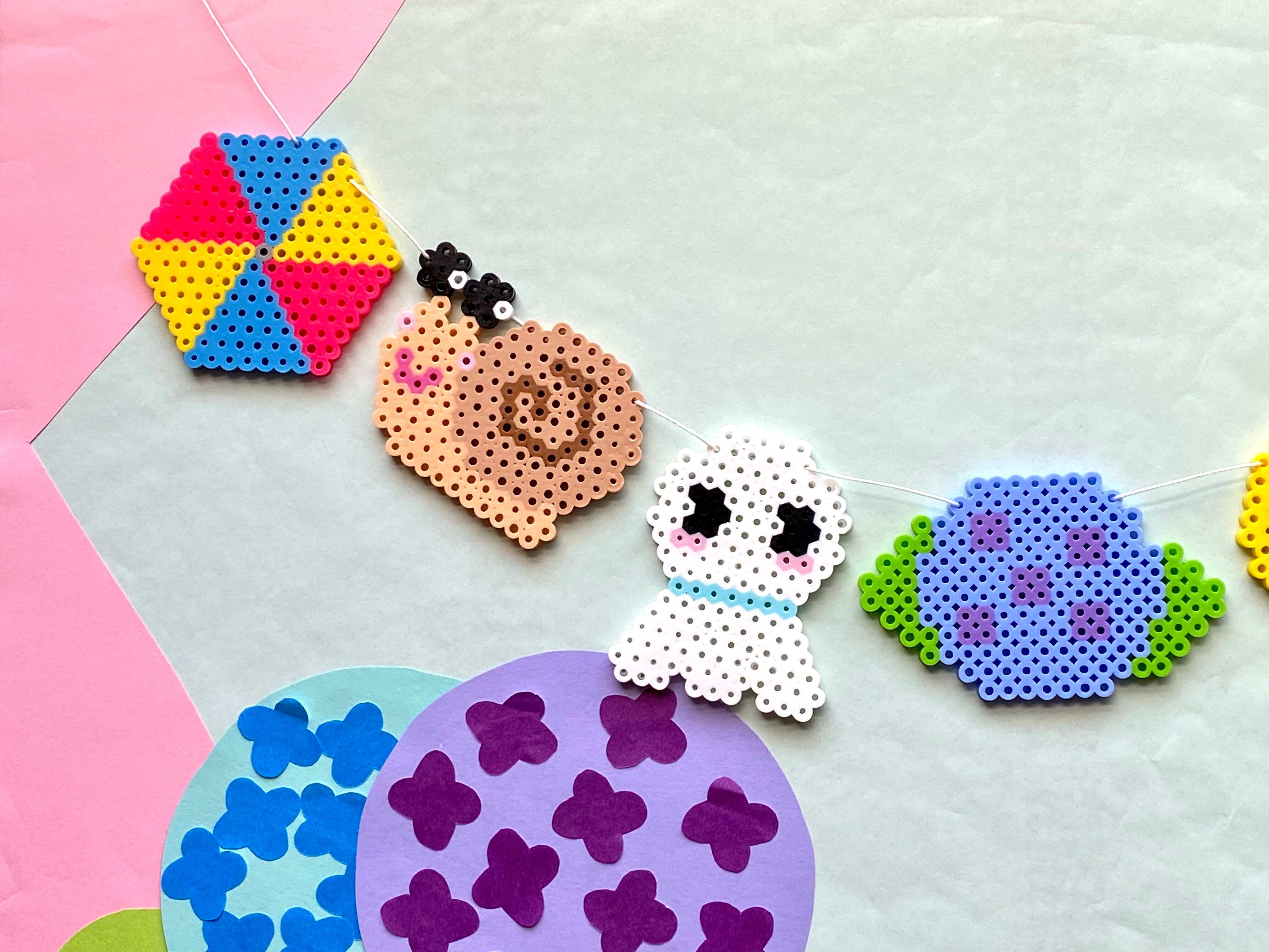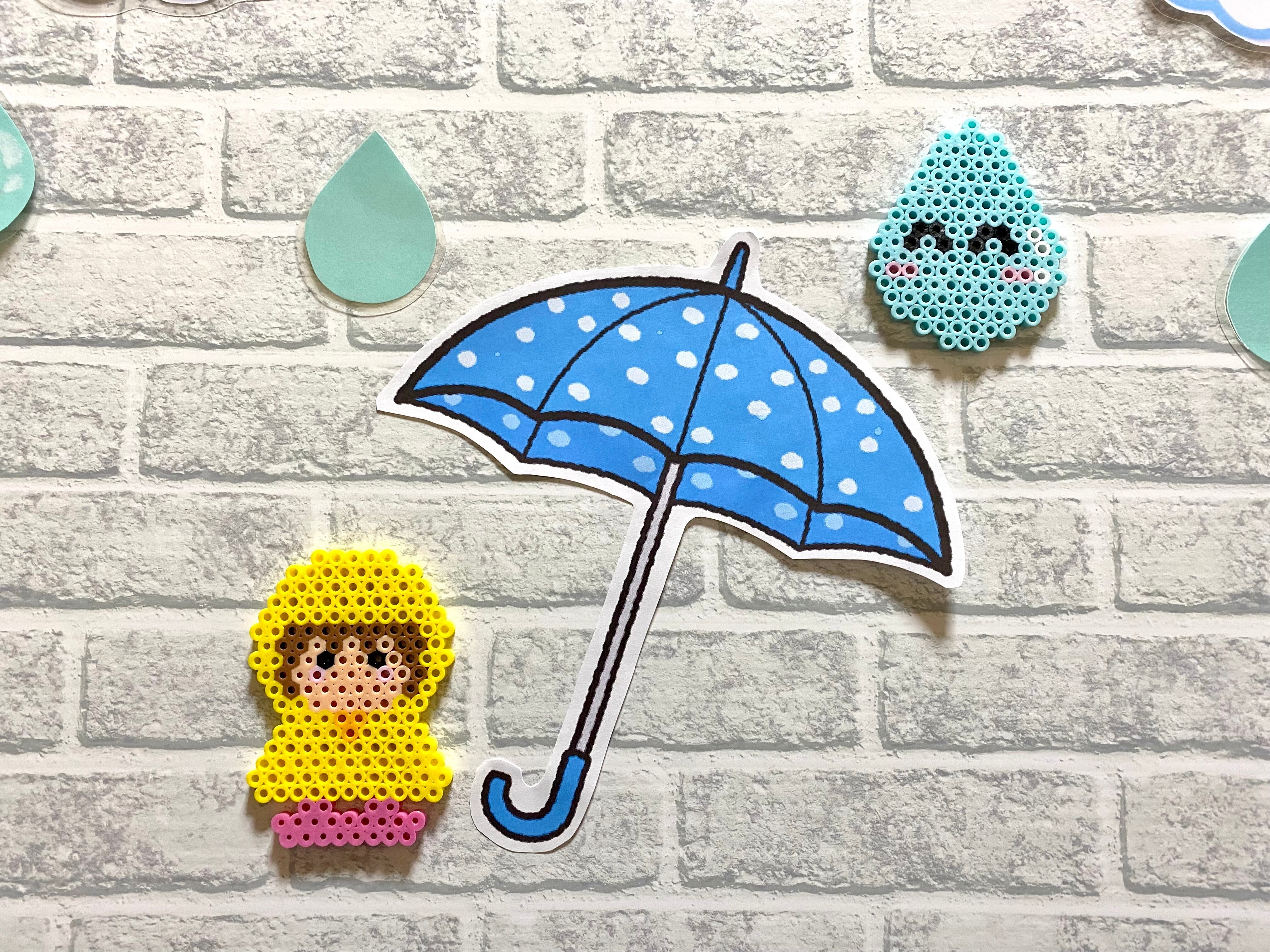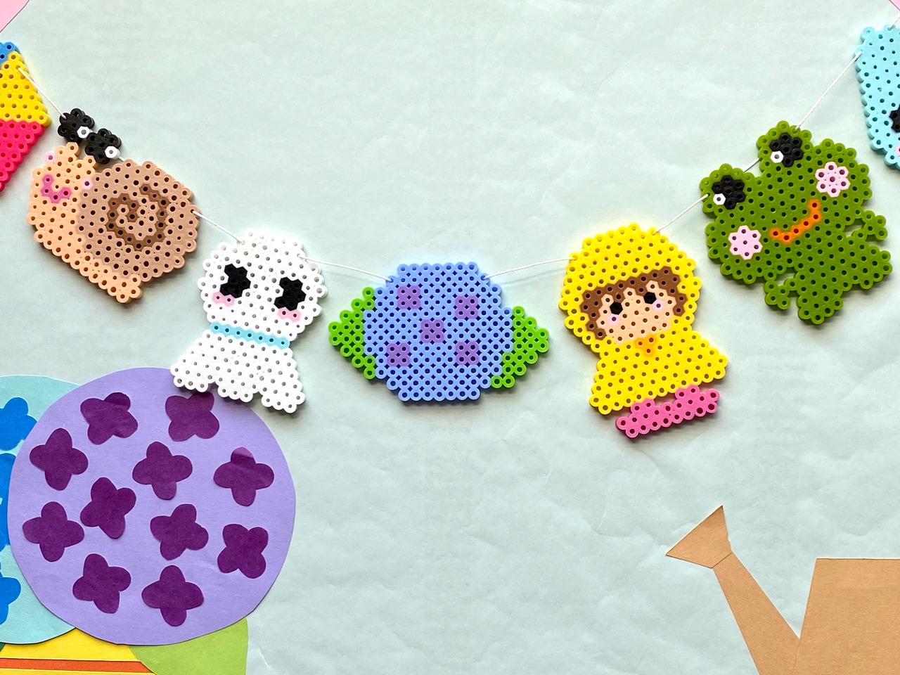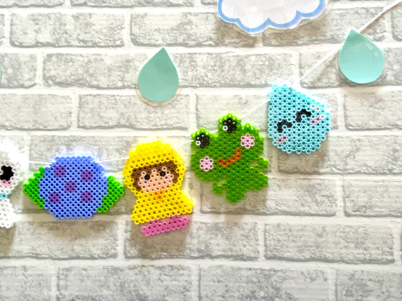 明るいカラーのビーズがハッピーな気分を呼び起こす、アイロンビーズで作った梅雨のガーランドです。