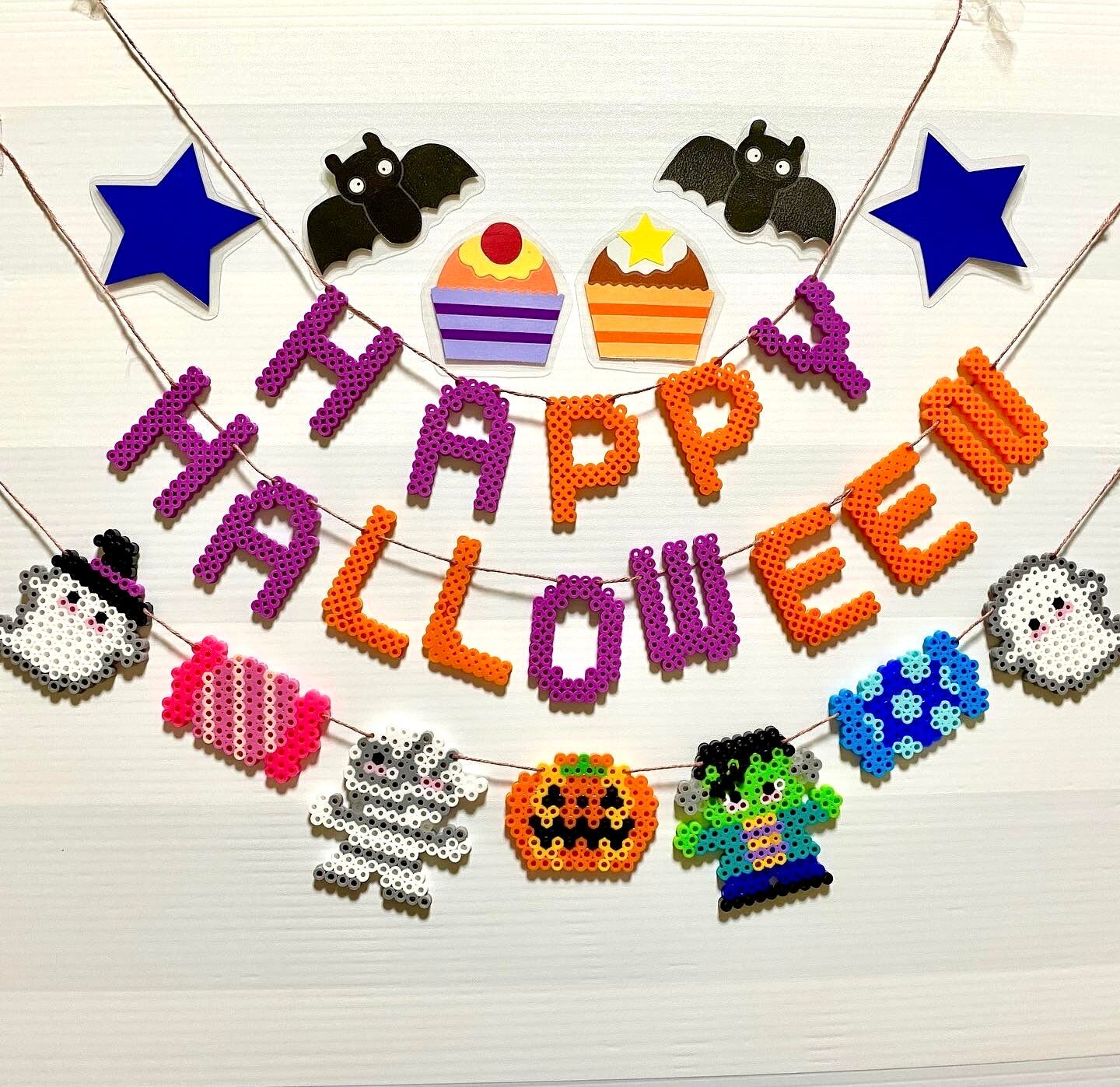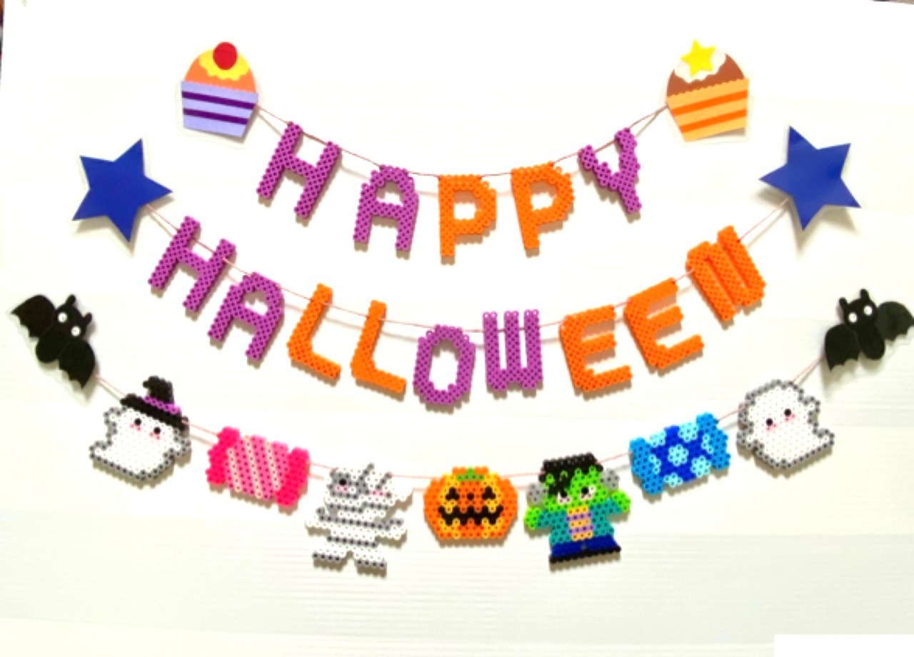 アイロンビーズで作られた怪物くんたちが可愛らしく飾られた、ハロウィンの季節にぴったりのガーランドです。