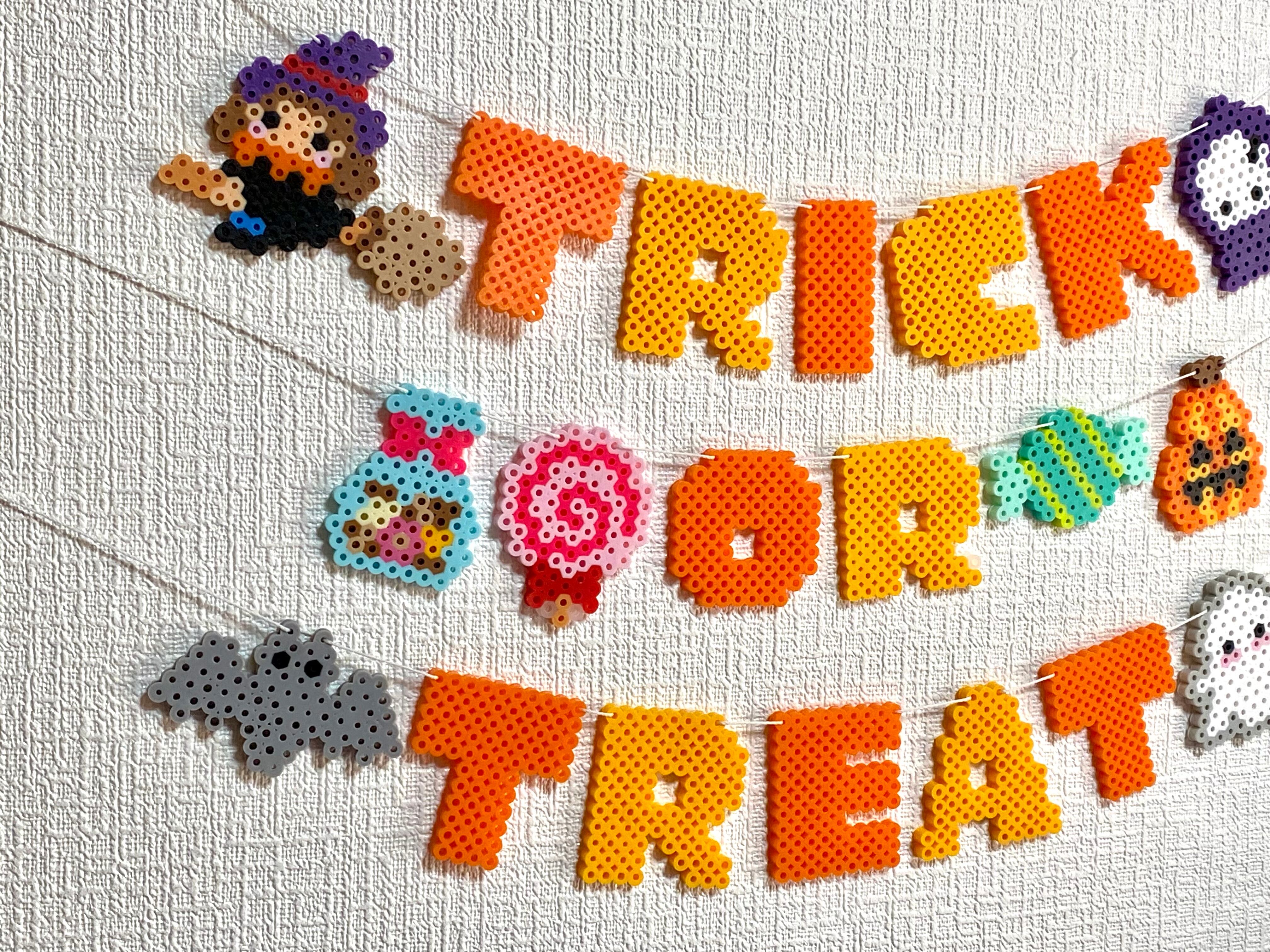 オレンジの文字とハロウィンアイテムで気持ちの上がるハロウィンガーランドを作りました。