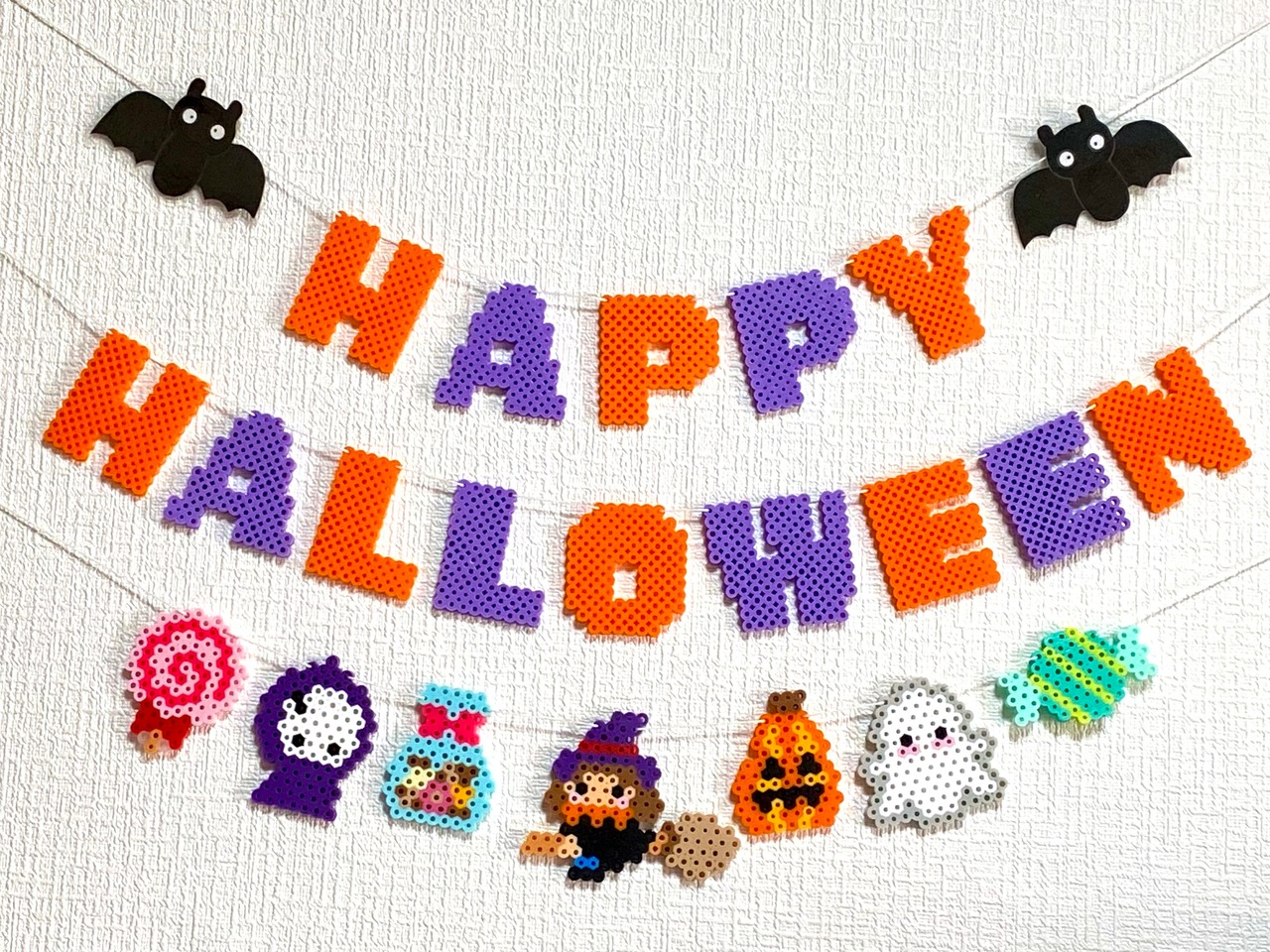 ハロウィンといえば!でお馴染みの魔女やキャンディを繋げたガーランドにハロウィンカラーの文字を加えたアイロンビーズのハロウィンガーランドです。