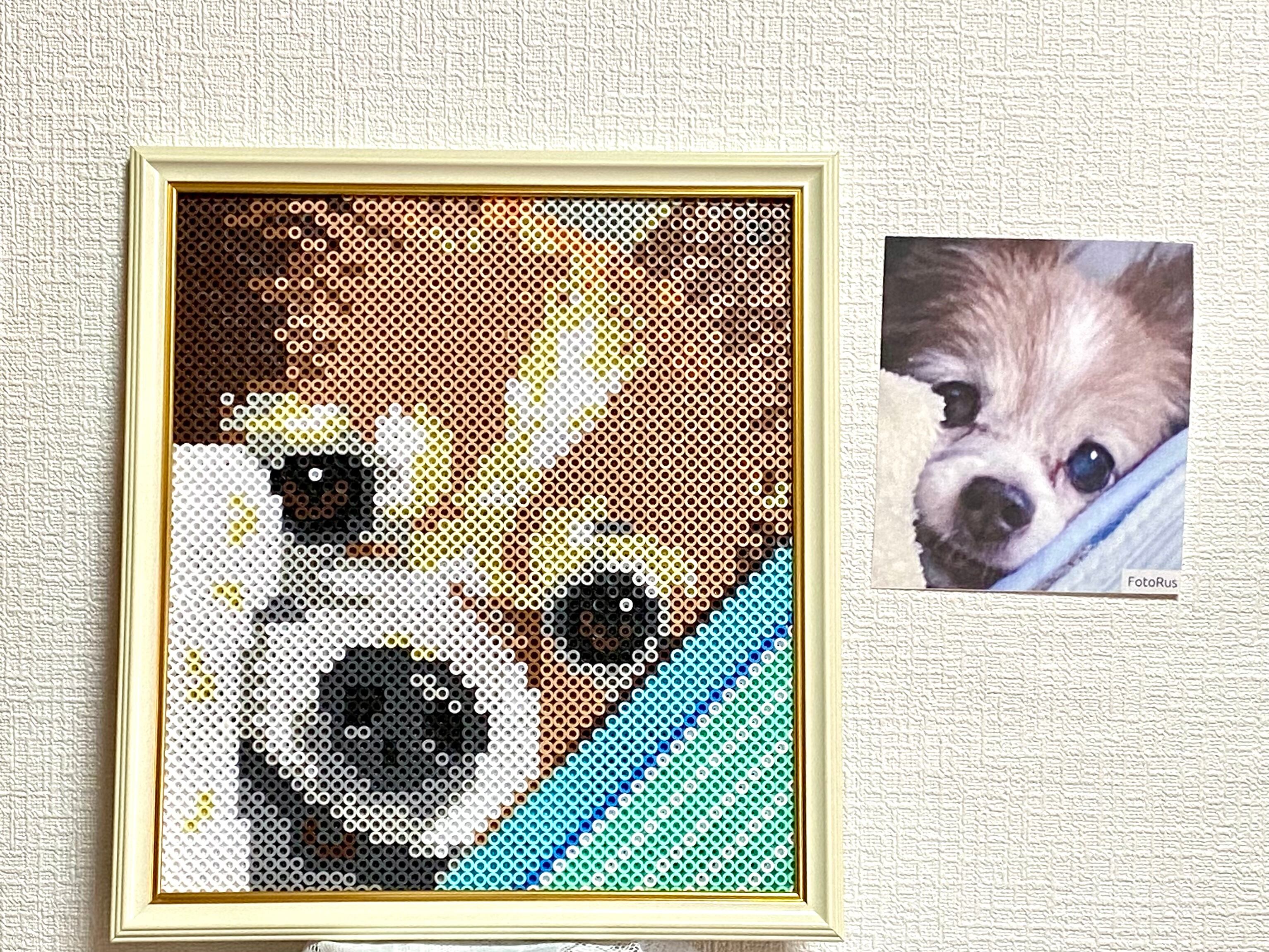 大切なペットのワンちゃんのお顔をアイロンビーズで似顔絵に表現した特別な壁掛けです。
