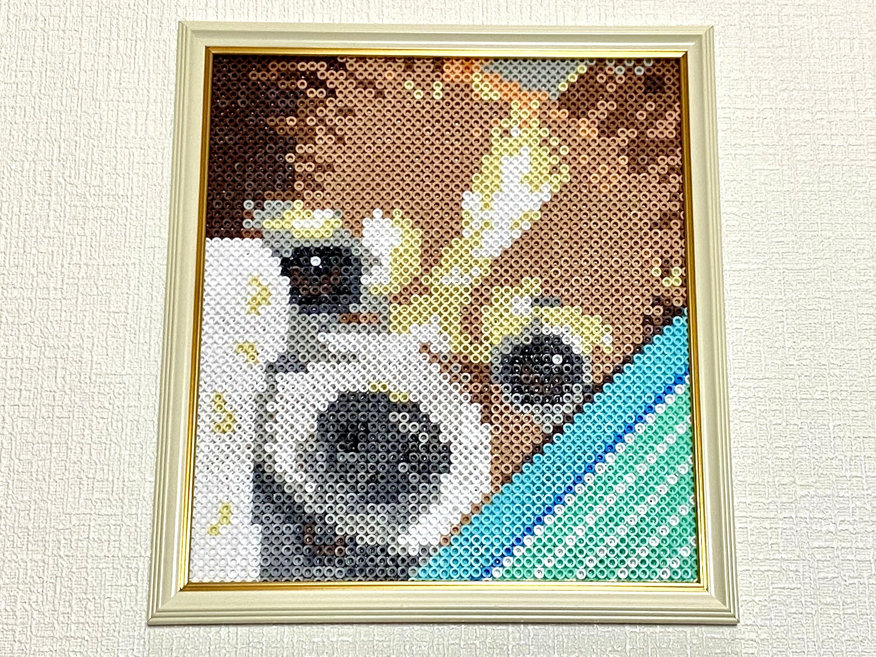 お写真のままでも素敵ですが、5㎜のビーズのドット画がポップでかわいい雰囲気を醸し出し一味違った壁掛けになっています。直射日光を避けていただければ色落ちも少なく長く飾っていただけます。