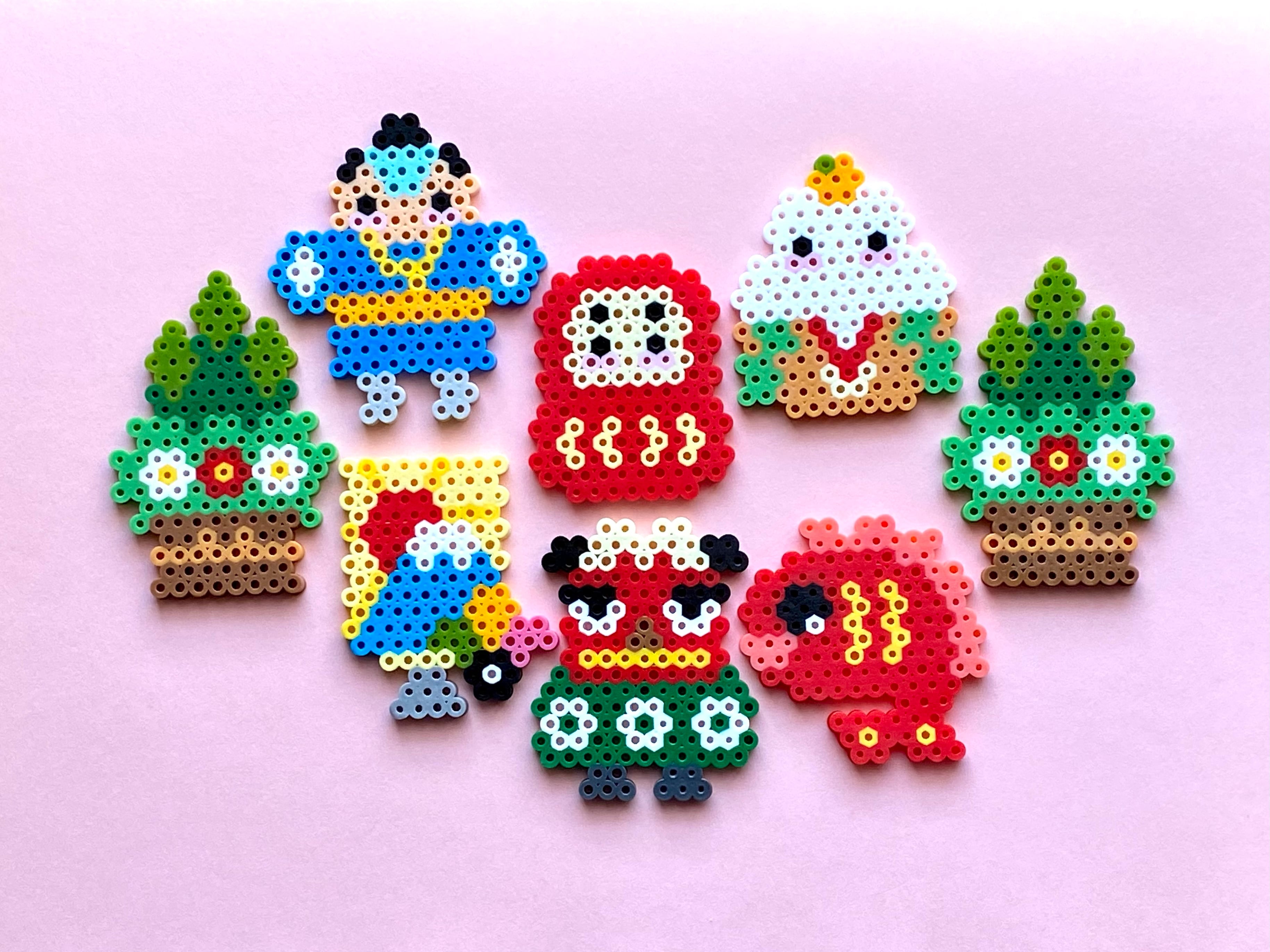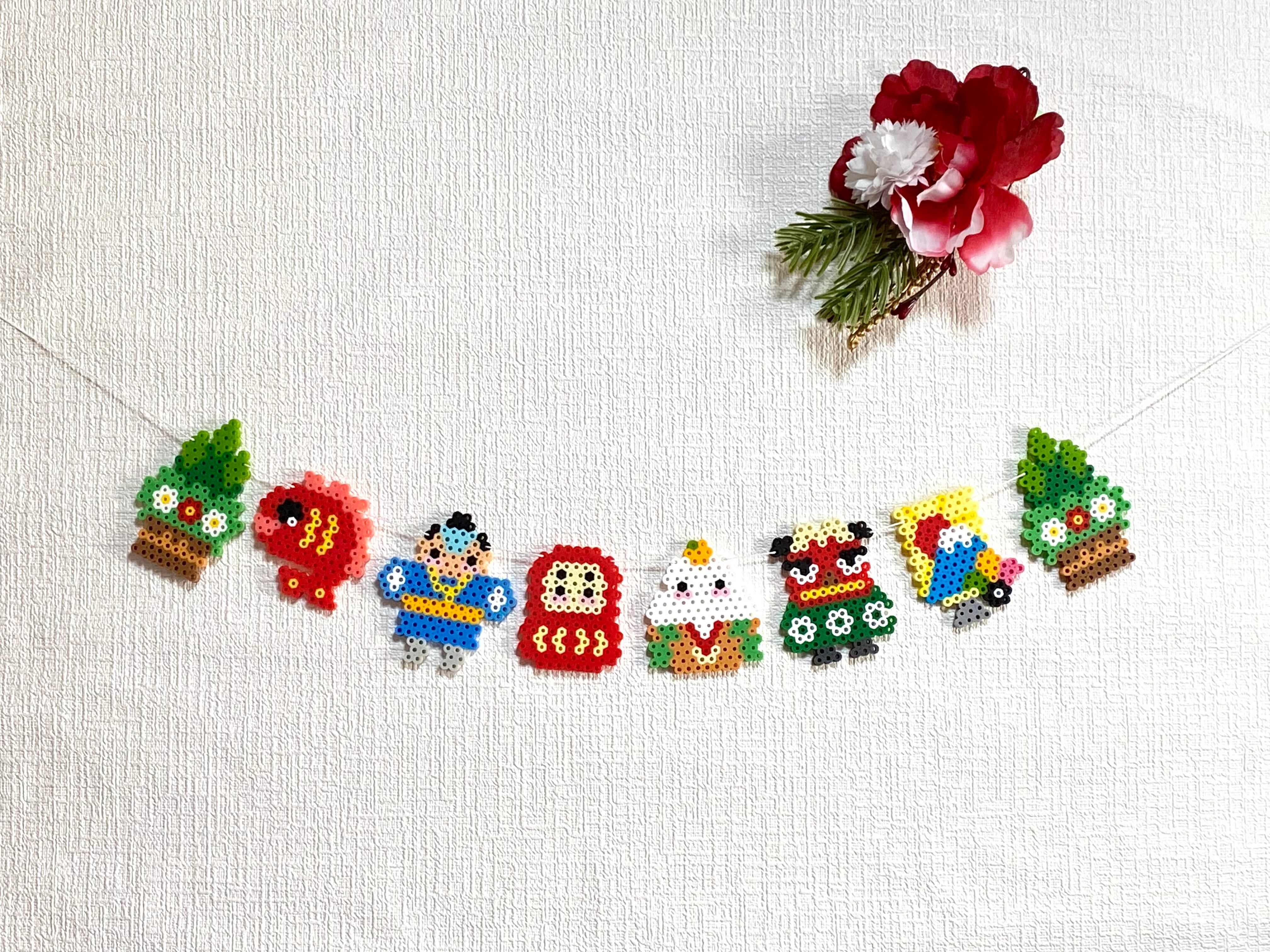 お正月といえば・・・で思い浮かぶたくさんのアイテムをひとつのガーランドにギュッと詰め込んだ新年に飾っていただきたいアイロンビーズのガーランドです。