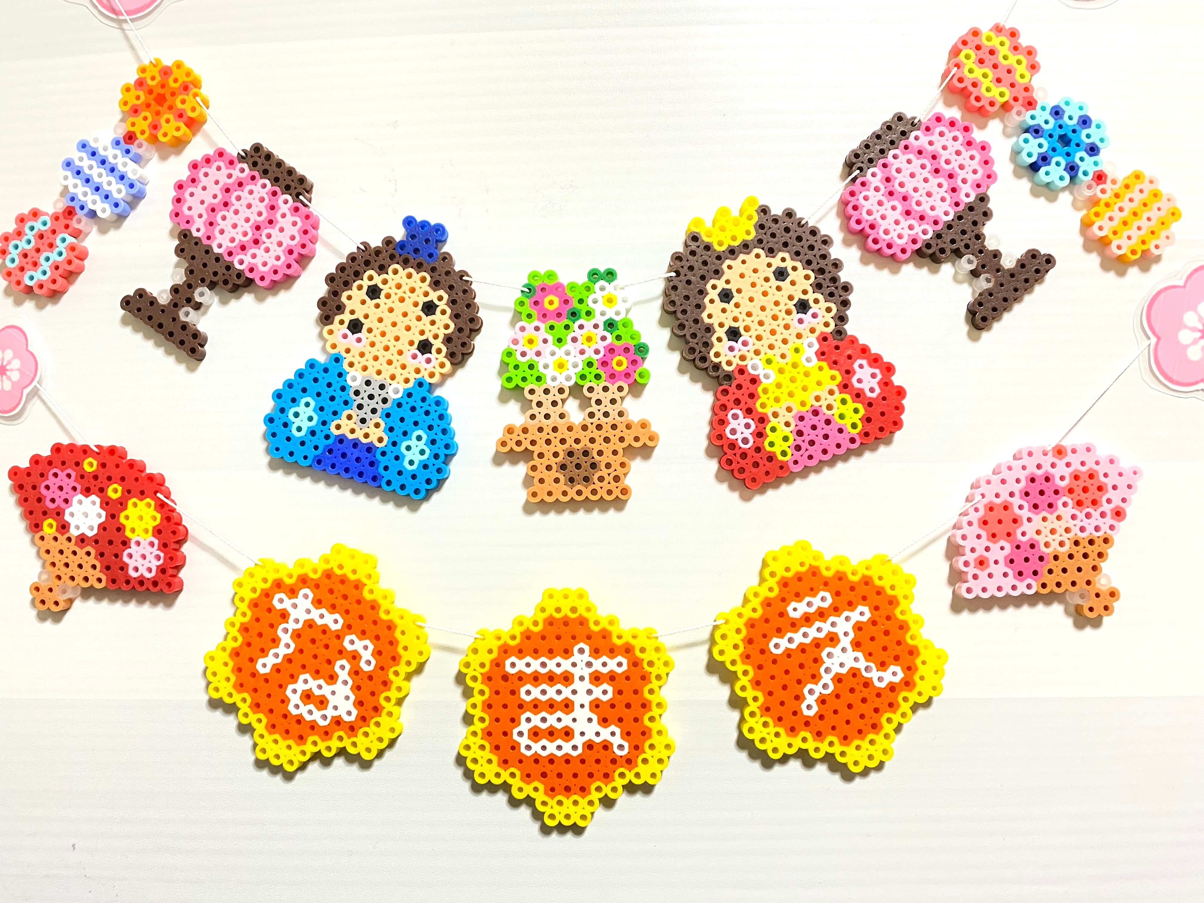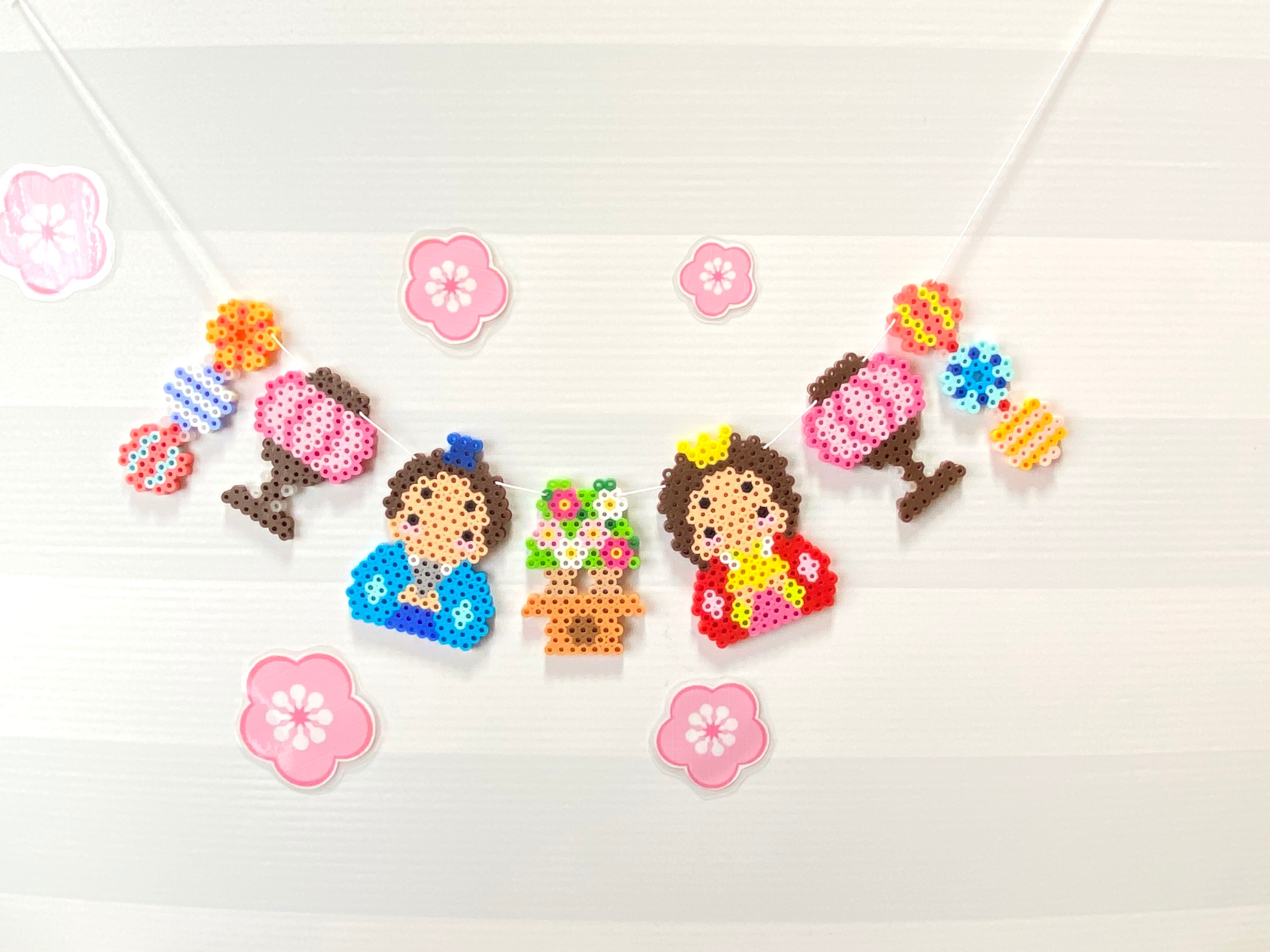 男雛と女雛はお顔や体のフォルムが少し丸く、幼く優しい雰囲気に仕上がりました。雪洞やお花、つるした飾りも加えて、色もカラフルに華やかなひな飾りです。