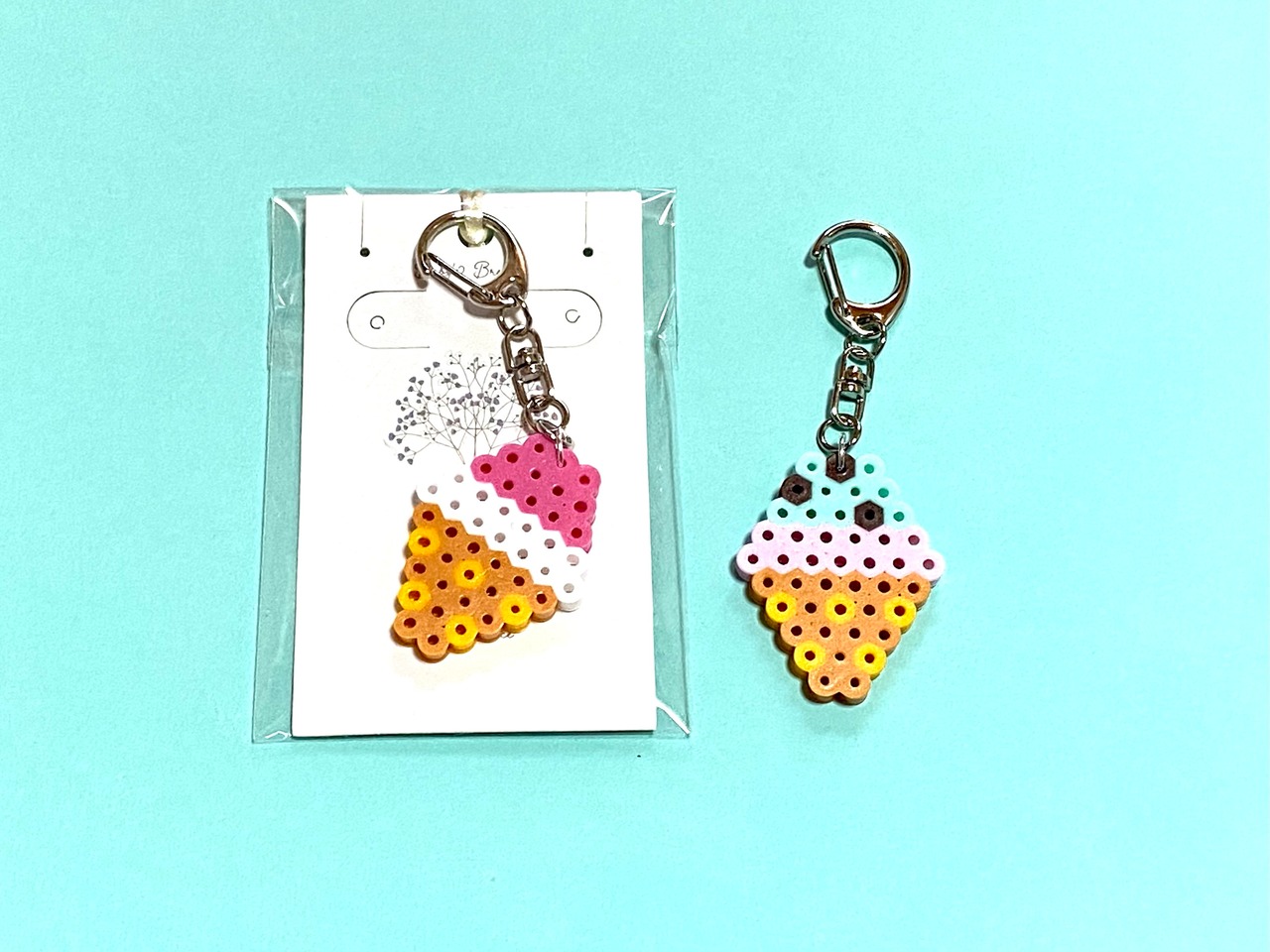 アイロンビーズで作られたアイスクリームのキーホルダーです。手のひらに収まるサイズで、バッグやポーチなどに付けて気軽に持ち歩けます