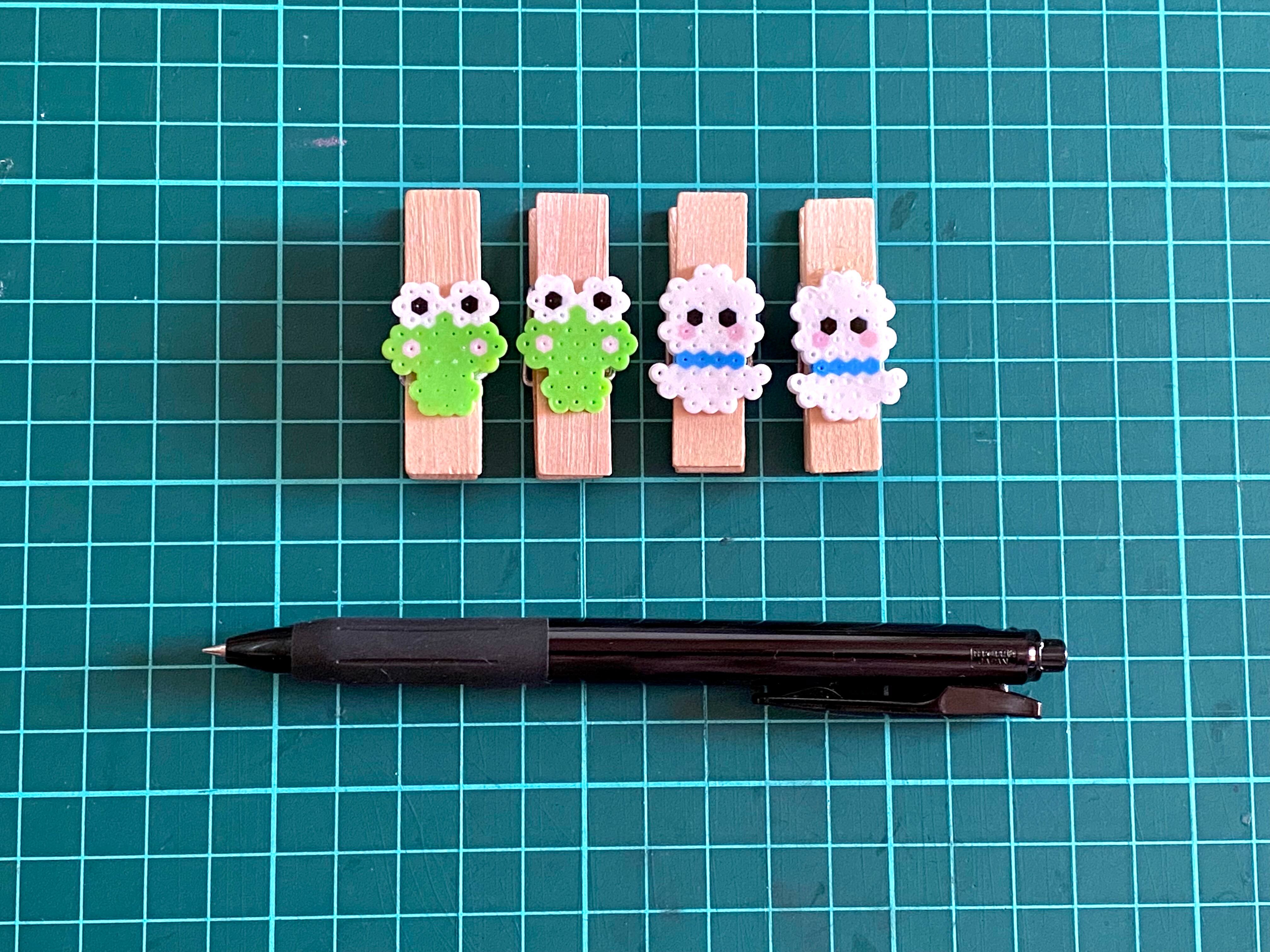 てるてる坊主とカエルのパーツは小さいサイズのアイロンビーズで作っています。