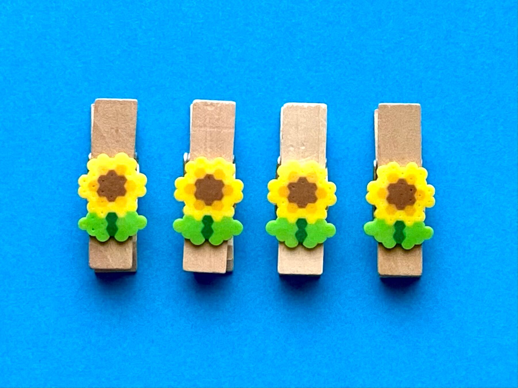 アイロンビーズで作ったひまわりを飾った木製のクリップです。
